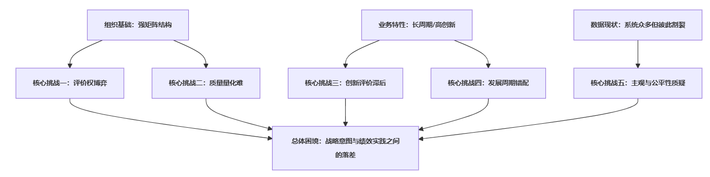 上述特征在现实运作中并不是静态存在,而是通过日常管理不断相互作用,演化为“权责、质量、创新、发展、公平”五个维度上的系统性挑战。这些挑战若处理不当,会让绩效管理偏离“战略牵引与人才发展”的定位,滑向“年终打分与奖金分配”的窄化角色。
