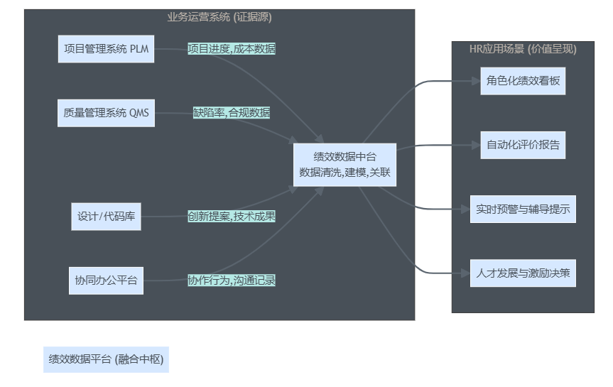- 以绩效系统或数据中台为枢纽,将项目管理系统、质量系统、设计与代码库、协同办公平台等关键证据源系统的结构化数据接口打通;