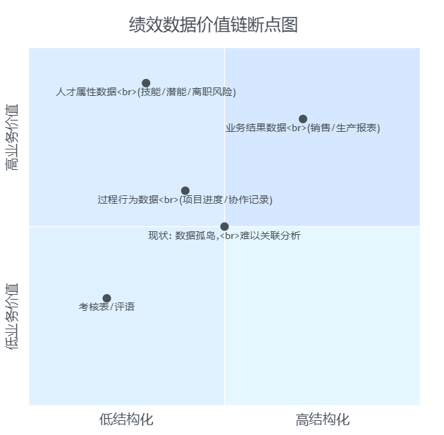 可见,真正价值高的数据(如人才属性、过程行为)要么结构化程度不高,要么被割裂在多个系统中难以利用,而绩效表格本身虽然结构化,却业务价值有限。