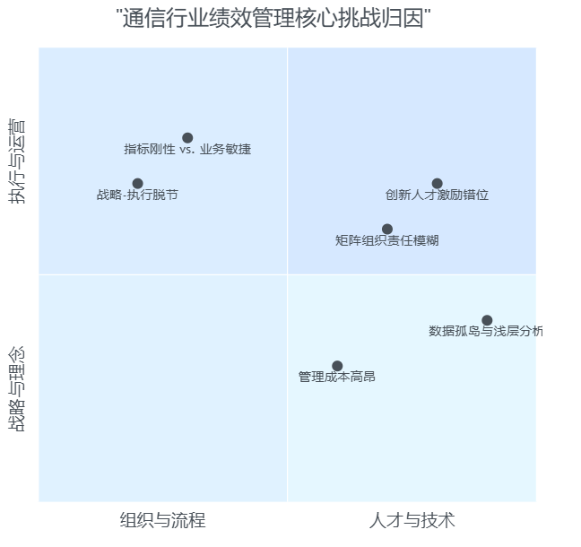 本模块的核心判断是:通信行业绩效管理之所以“用力很猛,效果一般”,根源不在某条考核条款设计得好不好,而在于战略、组织、人才与技术四个维度之间存在结构性错配,形成了一组组相互牵制的矛盾关系。