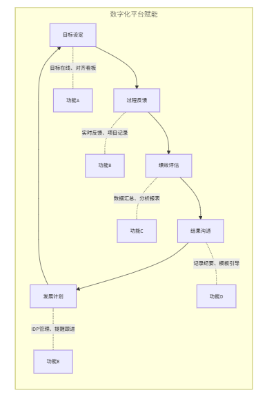 图中可以看到,绩效结果沟通只是闭环中的一个重要节点,而数字化平台则是贯穿目标、过程、结果与发展四个环节的“底座”。