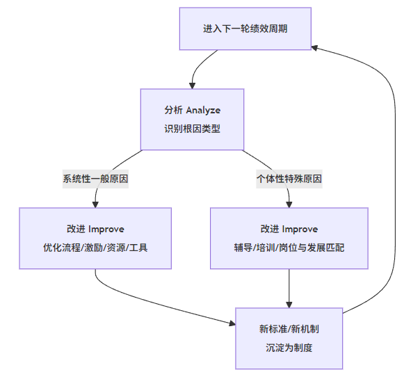 - 在每轮绩效结束后,认真走完“界定差距–分析根因–制定并实施改进”的基本动作;