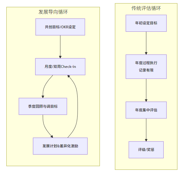 | 时间节奏 | 年度/季度集中评估 | 持续目标管理与高频反馈 |