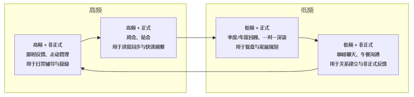 | 沟通方向 | 上级单向告知、评价 | 上下双向交流,包含反馈、提问、共创方案 |