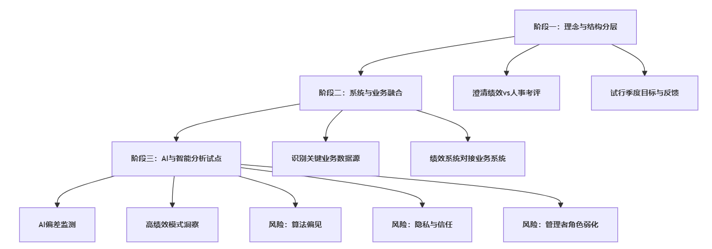 本模块结论:2025年的绩效管理创新,不是简单换一套表格,而是围绕四个关键词重构体系:分离(职责分层)、嵌入(数据入流)、洞察(AI辅助)、持续(目标与反馈敏捷化)。这些策略的共同目标,是让主观判断“有边界、有依据、可讨论”。