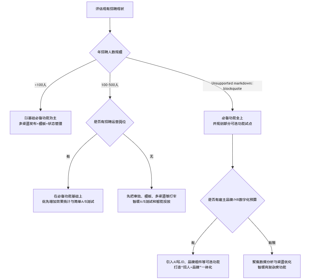 | 典型功能 | 职位模板与字段、审批与合规、多渠道发布、状态管理、效果统计 | AI写JD、A/B测试、智能投放、雇主品牌组件、人才库/内推联动等 |