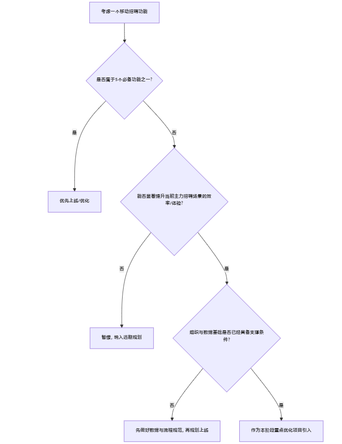 | 发展阶段 | 已有成熟PC招聘流程,移动端刚起步 | 完成本节提到的5个必备功能闭环,特别是面试管理与审批 | 根据主力场景选择1–2个可选功能深挖 |