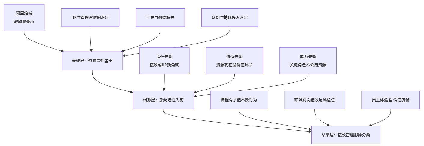 “绩效资源投入不足”不是一句简单的“钱少、人少”,而是一个表现层资源匮乏、根源层系统失衡、结果层管理失效的综合性问题。要有效应对,先要看清它的结构,而不是只盯着预算表。