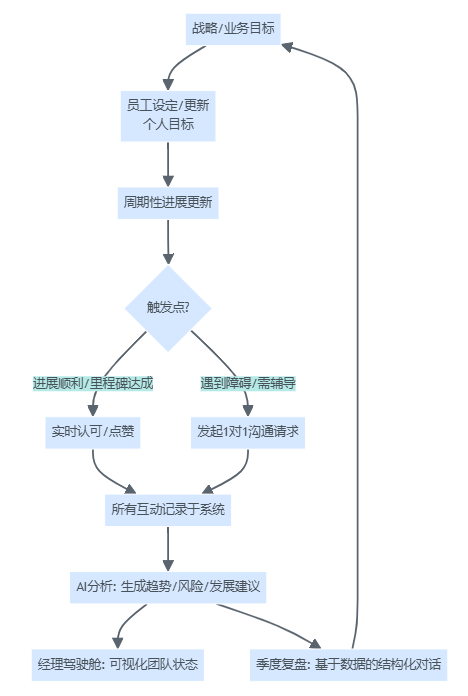 | 管理者角色 | 年底“裁判”,主要工作是打分和解释结果 | 全年“教练”,持续对话、辅导、清除障碍 | 经理驾驶舱展示团队状态、预警风险、提示辅导对象 |