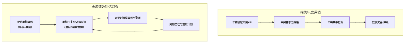 绩效管理系统落地难,一个直观表现就是——员工讨厌填表,管理者敷衍打分。根本原因在于:传统绩效强调静态指标和期末评估,忽视了过程中的对话、调整和支持。要在2025年扭转局面,需要引入“持续绩效对话(CPD)+敏捷目标”的新范式。