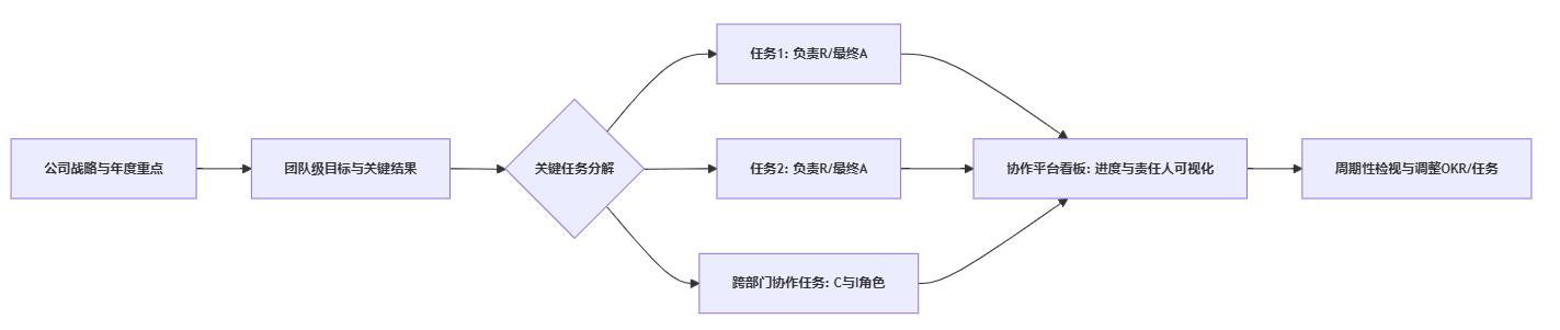 下面用一张简化图示展示“战略—团队目标—个人任务与RACI”的对齐关系: