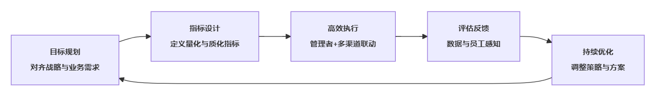 | 结果层 | 量化 | 关键信息理解度 | 问卷中“我清楚了解XX战略/制度”的4–5分占比 | 员工问卷/脉搏调查 | 季度/项目 |