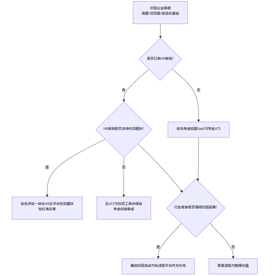 - 在已有流程管理系统(ATS或一体化HR云)的基础上,引入平台E(校园活动运营与私域型)作为补充;