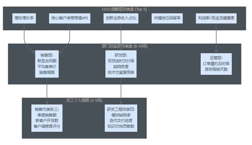 - 高层仪表盘:3–5个聚焦企业健康度与竞争力的指标,如营收、利润、现金流、客户体验、关键人才等;