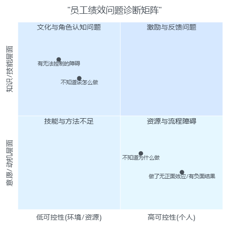 - 应用前文的绩效归因模型,判断“不会、不愿、不能”的不同情形;