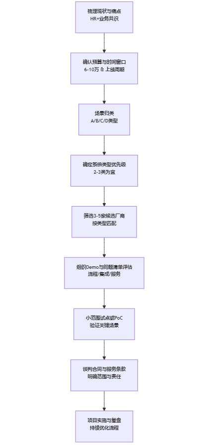 可以用一个简化的流程,来回答“预算6-10万招聘流程管理系统怎么选”这一长尾问题。