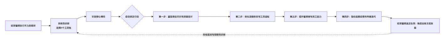 - 再做修正:沿着“重塑理念共识—优化流程与工具—提升管理者与员工能力—强化结果应用与年度迭代”四步,推动绩效管理从“失效”走向“生效”。