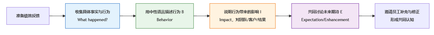 | 目标未达成 | 这次表现不合格,你要好好反省。 | 这季度目标还没完全做到(行为),我看到你中途接了两个临时项目(影响)。下季度我们怎么在任务优先级上做得更清晰?(期待) |