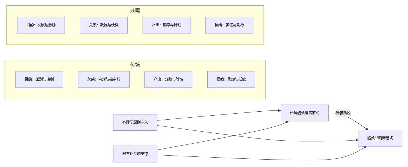 如果把绩效管理看作一条从“传统排名”走向“绩效共鸣”的进化路径,可以用下面这张框架图概括: