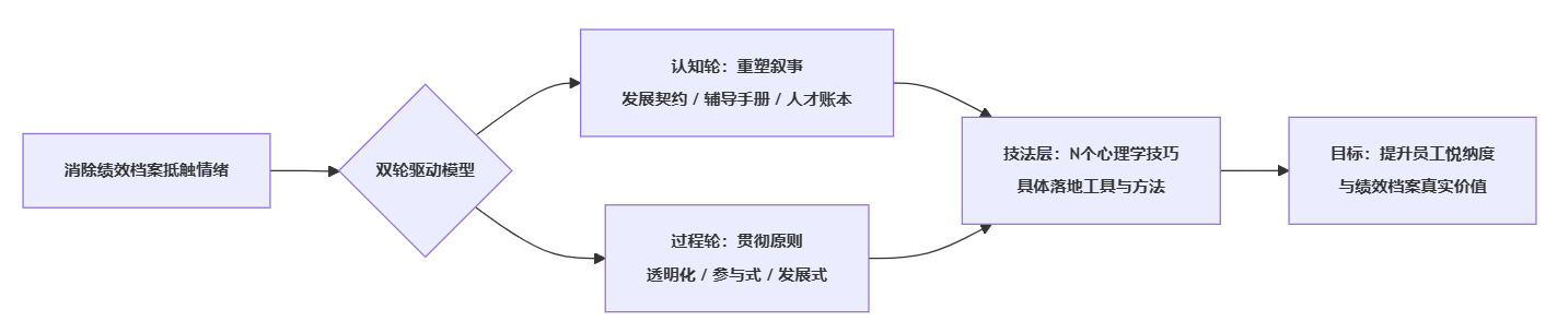 本模块结论: 在上述心法之下,可以针对“认知与信任”“过程与体验”“发展与价值”三个维度,设计一组可操作的心理学技巧,让绩效档案从一开始就带着“被接受”的基因。