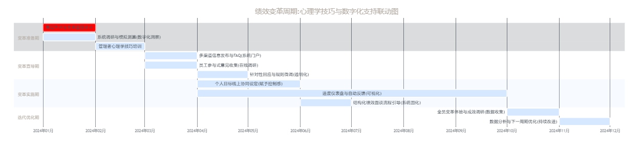 可以用一张时序图,展示“绩效变革全周期中,心理学技巧与数字化支持”的联动方式: