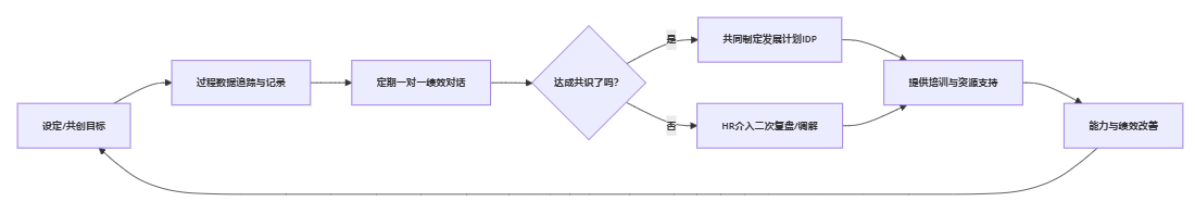 - 明确规定每月至少一次一对一绩效对话,系统中需记录时间与简要内容;