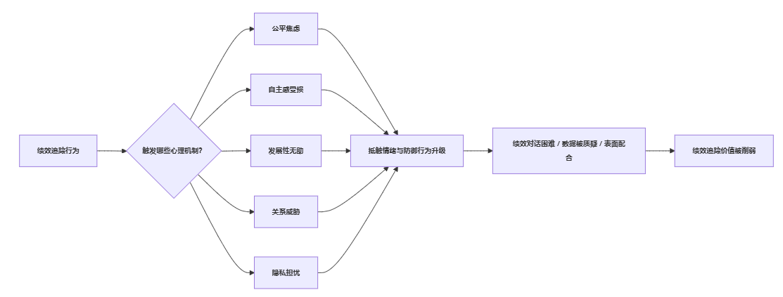 为方便HR在内部做宣导,可以借助一个简化模型,梳理绩效追踪如何触发不同心理机制,并引发抵触行为。