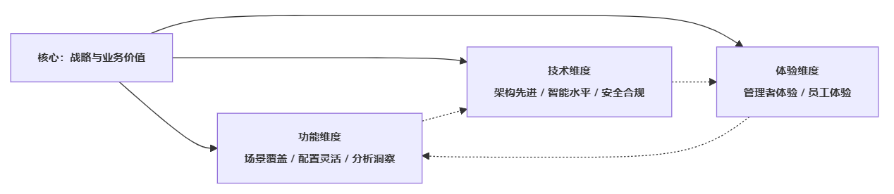 面对几款主流能力模型绩效系统,单纯看功能清单或界面演示,都不足以支撑正确决策。需要在功能维度、技术维度和体验维度上,搭建一个可量化评估的三角框架,既便于横向对比,又能与企业的战略目标相挂钩。