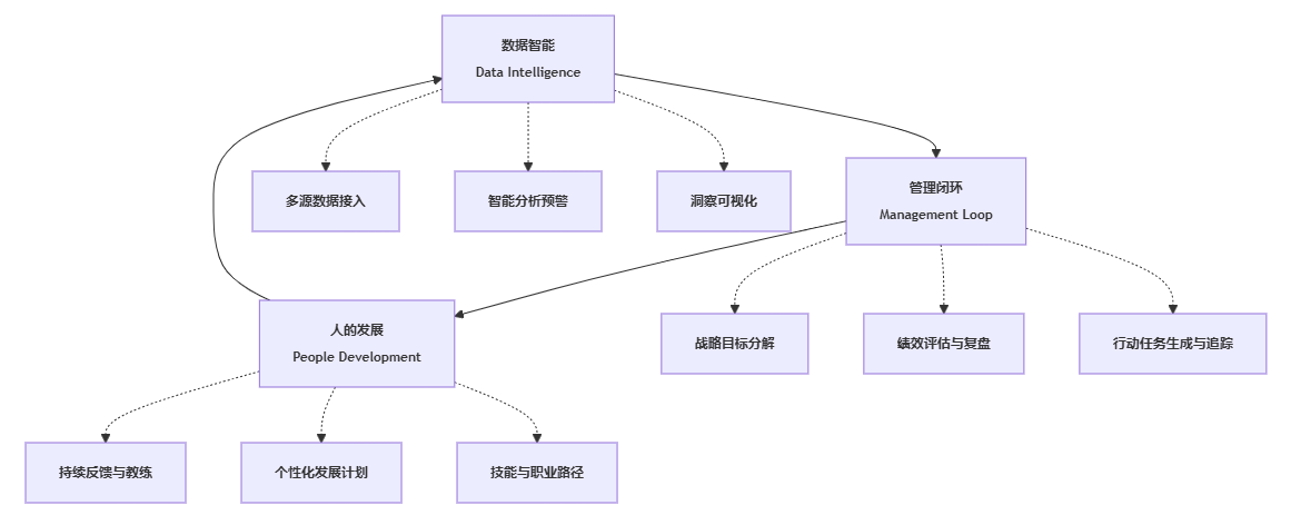 这样的系统解决了效率问题,却没有解决“绩效结果如何真正影响业务行为”的问题。我们更认同一种划分方式:把绩效智能化系统视作“数智化管理系统”的一个典型场景,它应包含三个关键环节: