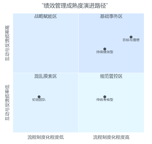 - 右下角“规范管控区”:流程较规范,但仍以年终考核为主,反馈频率不高;