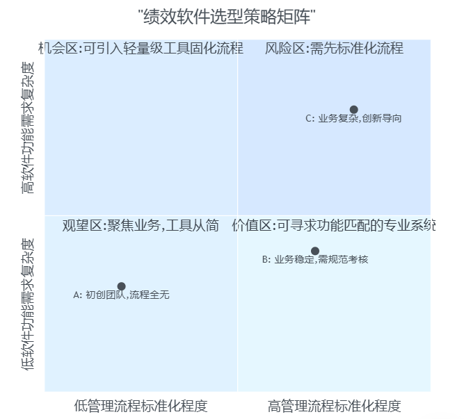 - 位于中右部的企业(B):是“轻量级+经济型绩效软件”的主力用户;