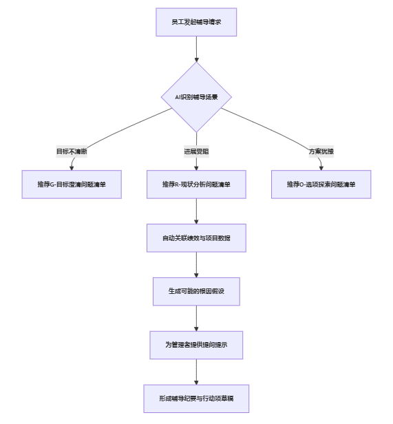 为便于理解,可以用一个简化的智能引导流程图表示“员工发起辅导—系统识别场景—推荐合适谈话框架”的过程: