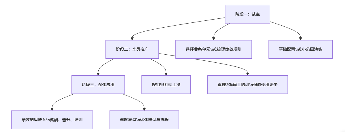 | 阶段一:试点设计 | 打通制度与系统,跑通闭环 | 明确绩效规则;选1–2个业务单元试点;系统基础配置 | HR、业务线管理者、IT、供应商 |
