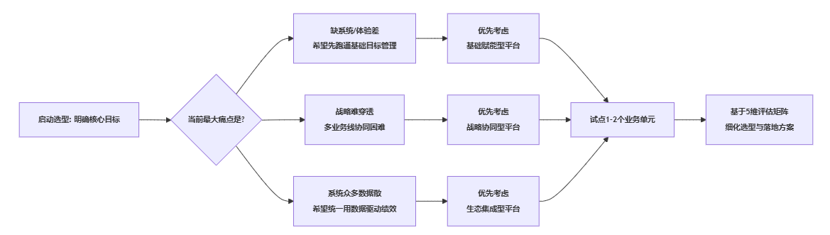 下面用一个简化的流程图,总结大中型企业在选择轻量级绩效平台类型时的思路: