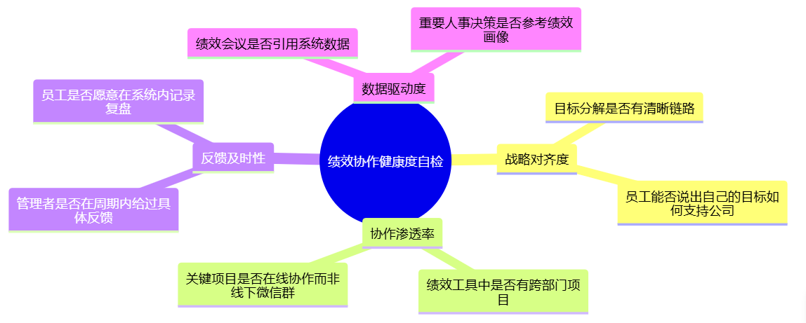最后,可以用一张简易“绩效协作健康度”思维导图,帮助企业自查自身所处阶段。