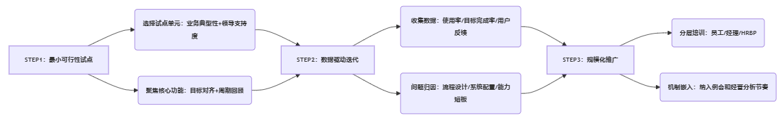 与其一开始就追求“全模块上线”,不如先选一个业务相对典型、管理基础较好的单元,跑一个“最小可行性”(MVP)项目。
