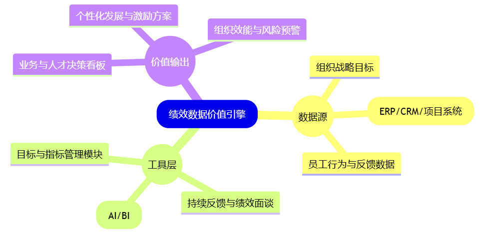 可以用一个简单的思维导图,来理解“绩效数据价值引擎”的样子: