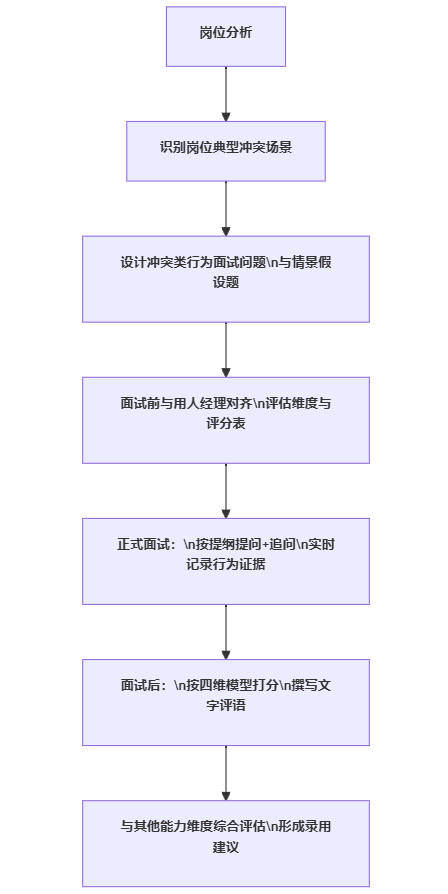 为了让以上方法真正落地,可以将“冲突处理能力考察”嵌入到整体面试流程中,而不是临时想到才问一句。