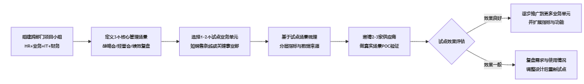 对于已经在考虑上马或升级绩效仪表盘的大中型企业,可以从下面这条“简化版实施路径”入手,将本文的方法变成行动: