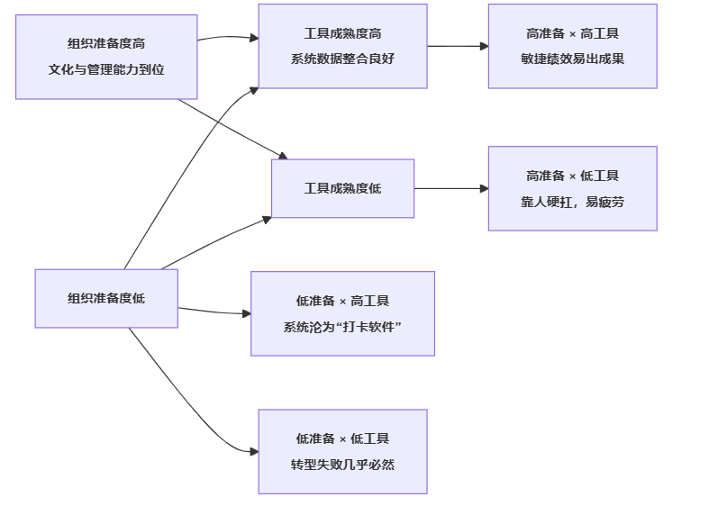 可以用一个简化的“成功要素象限图”,来理解工具与组织准备度之间的关系:
