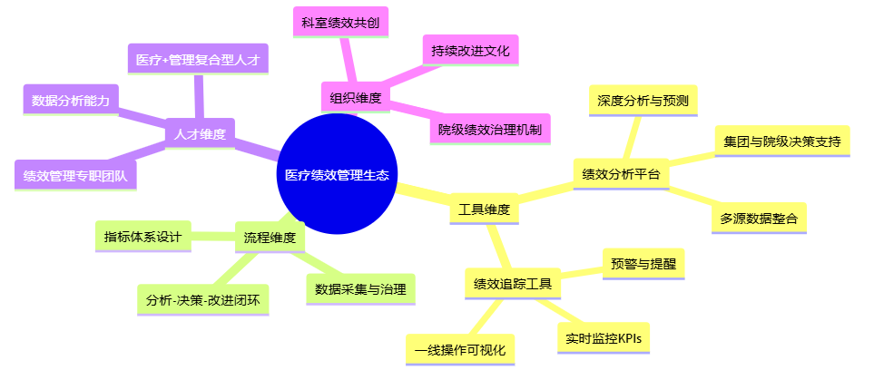 为了帮助管理者在脑中形成更完整的画面,可以用一张简单的思维导图概括“医疗绩效管理生态”的关键要素: