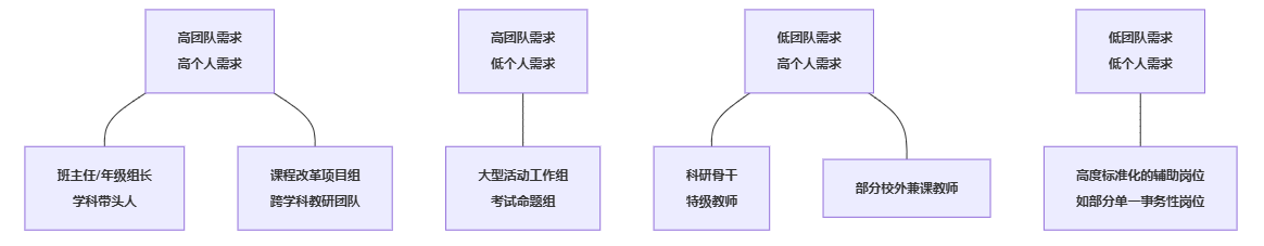 - 教师同时隶属多个团队:既是学科组成员,也是班主任团队成员,还可能是某个课题组核心骨干;