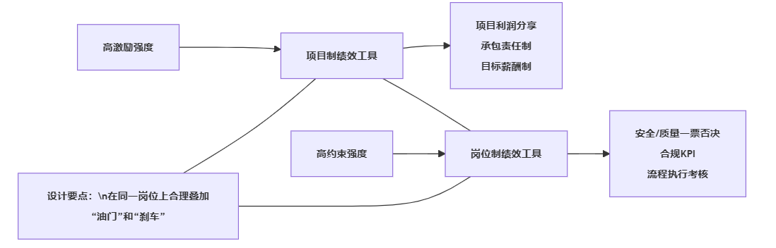 - 对项目经理、技术负责人等核心岗位,要让项目制占据主要权重,同时用岗位制锁住安全、质量、合规底线;