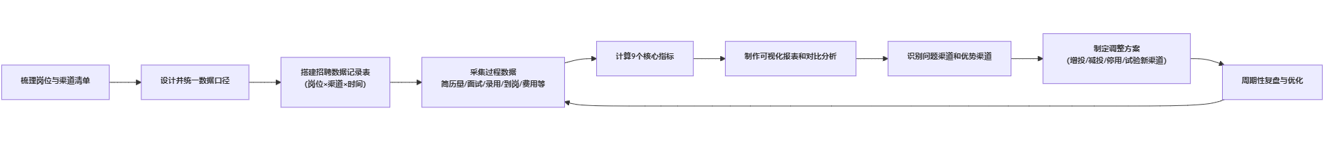 下面用一个流程图,概括“如何评估招聘渠道效果”的数据分析步骤: