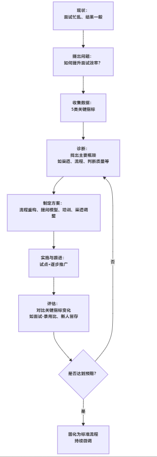 | 面试/招聘成本 | 当前效率“值不值”? | 单录用平均面试时长、差旅和系统成本 | 精简轮次,引入结构化提问,区分面试类型 |