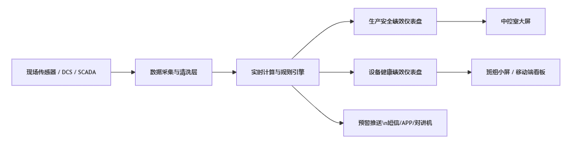 | 油气开采 | 井场生产与安全管理 | 井筒压力、产量、设备状态实时监控;隐患闭环追踪 | 以绩效仪表盘为主,辅以月度报告系统 | 单井产量、非计划停机、隐患整改率、伤害率 |