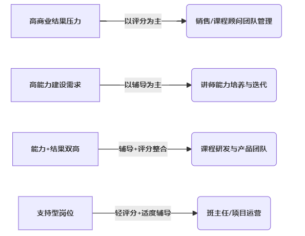 - 在课程研发等兼具能力与结果双重要求的岗位,构建“评分—辅导—再评分”的螺旋循环。