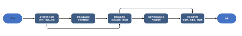 | 新员工绩效 | 新员工在试用期及前1–2年的绩效表现 | 招聘质量的核心锚点 | 绩效与招聘数据完全脱节 | 在绩效系统中增加“招聘来源”等字段 |