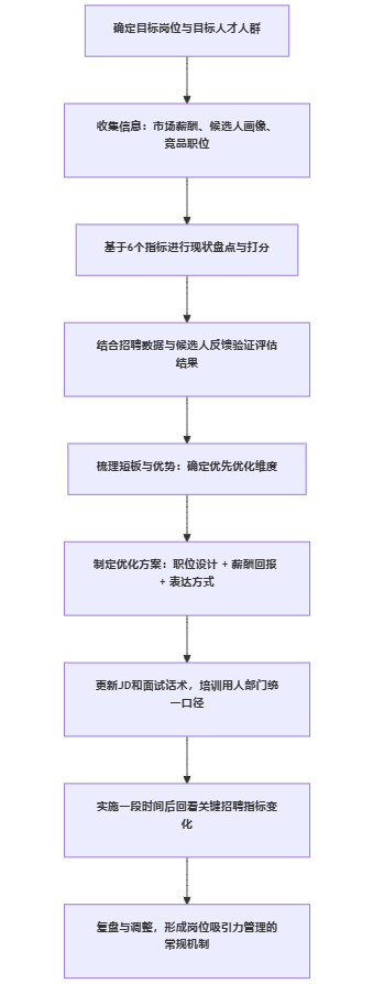 flowchart LR A[市场与候选人洞察] --> B[界定目标人才画像] B --> C[基于6个指标进行职位现状评估] C --> D[识别短板与优势组合] D --> E[制定优化方案:设计+表达] E --> F[落地到JD、面试话术与用人部门协同] F --> G[监测数据:投递量、转化率、反馈] G --> H[复盘与模型校准]