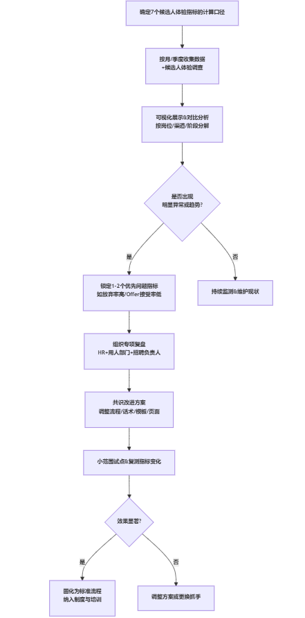 为了避免“看了很多指标,却不知道先做什么”,可以借助一个简单的流程来落地候选人体验分析与改进。
